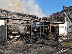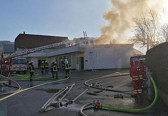 Die Freiwillige Feuerwehr Hofstetten-Grünau begann unverzüglich mit der Brandbekämpfung und dem Schützen der nebenan liegenden Wohngebäude mit neun C-Rohren. Aufgrund der Hitzeentwicklung weitete sich das Feuer jedoch auf die Decke des lehrstehenden Geschäftslokals aus.