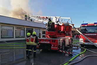 Mit zwei Kränen wurde in der Folge das Dach abgehoben, um eine effiziente Brandbekämpfung unter schwerem Atemschutz durchführen zu können.